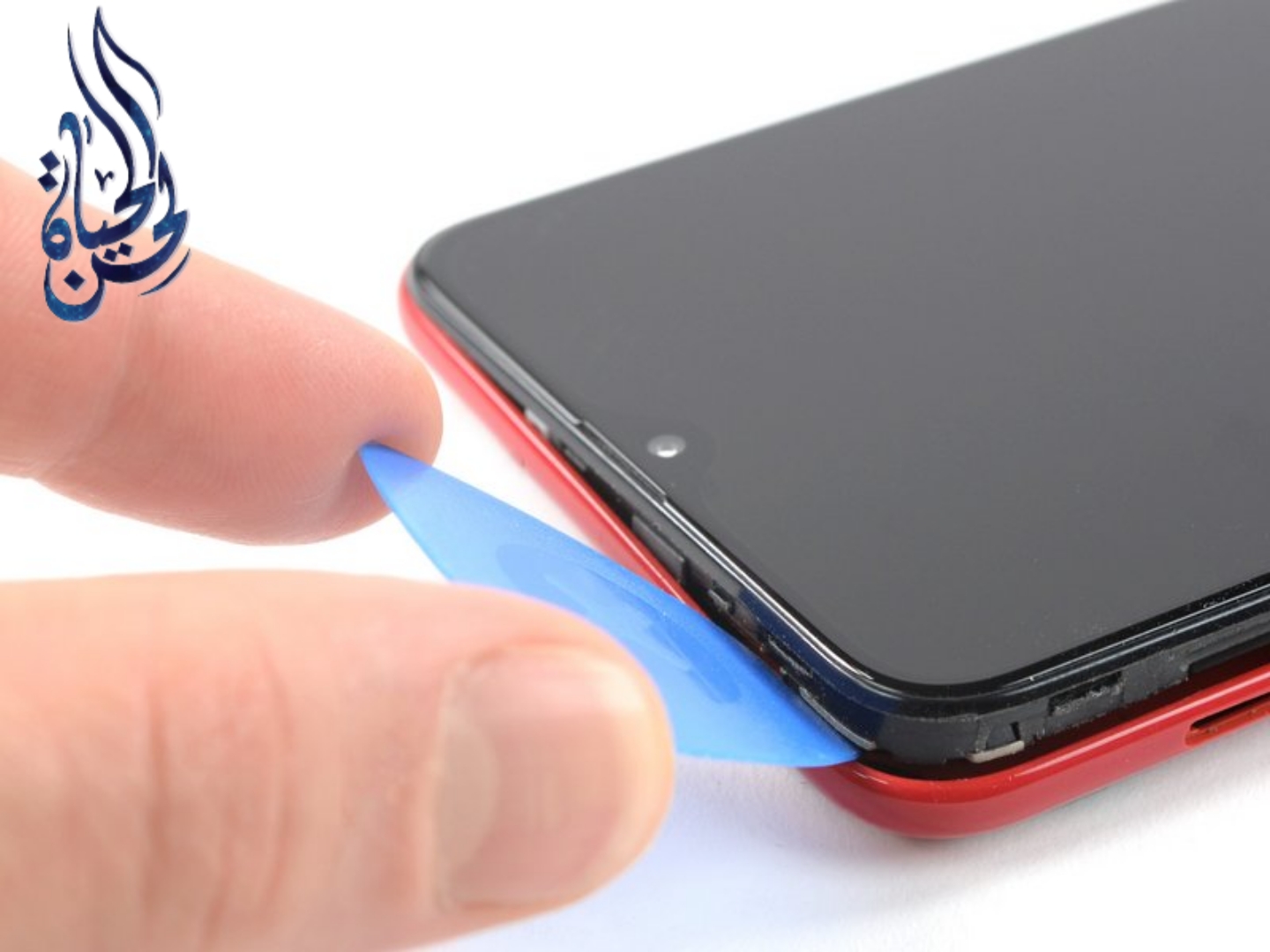 أدخل أداة فتح ثالثة أسفل الزاوية اليسرى العلوية من الشاشة. أدخل أداة فتح ثالثة أسفل الزاوية اليسرى العلوية من الشاشة. قم بتمرير الفتحة على طول الحافة العلوية للهاتف لقص المادة اللاصقة. عند الاقتراب من الكاميرا الأمامية ، اعمل فقط بطرف فتحة الفتحة لتجنب إتلاف الكاميرا أو تلطيخها.