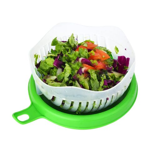 ضع كل مكونات السلطة في هذا الوعاء وقم بتقطيعها عبر الشبكات. قم باللف والتكرار ، وستترك مع الخس والخضار المفروم بشكل مثالي. فقط انقليه في طبق وأضيفي الصلصة